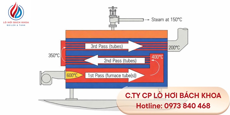 Nhiệt từ quá trình đốt truyền qua thành ống và thân lò, làm nước bên trong sôi lên và tạo hơi. Hơi nước sau đó được dẫn ra ngoài để phục vụ các mục đích sản xuất, trong khi khí thải được xử lý và thoát ra ngoài qua ống khói.